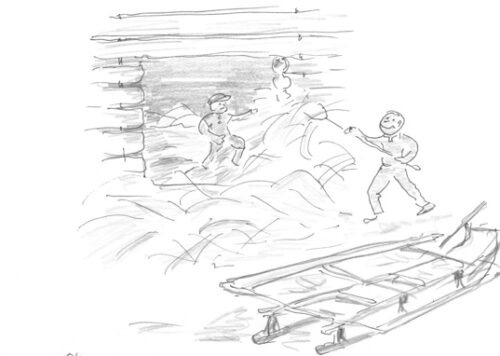 Pyhäpäivinä oli käyty kirkossa aiemmin Rautalammilla ja myöhemmin Pielaveden Kirkkosaaren kirkossa. Kun Pielaveden kirkkoa rakennettiin toimitti Juho Huttunen laipiolautaa kirkonrakennustarpeiksi. Kesäisin kirkkoon mentiin kirkkoveneillä. Näitä veneitä säilytettiin Hutunrannassa ja Likolahdessa. Talvisin kirkkomatkat oli tehty hevospelillä reessä. Kertoman mukaan oli kyläläisillä ollut tapana kirkkomatkalla kilpailla vene- ja rekikunnittain ketkä ehtivät ensin perille kirkkoon.